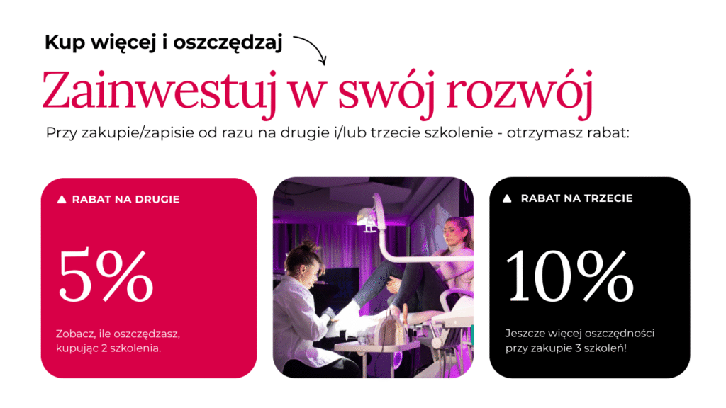 Szkolenie PremiumPedi+ jest właśnie dla Ciebie! To podstawowe szkolenie, które dostarczy Ci niezbędnej wiedzy teoretycznej oraz umiejętności praktycznych. Podczas tego intensywnego kursu dowiesz się, jak prawidłowo dbać o stopy i paznokcie, poznasz różne techniki pracy oraz nauczysz się rozpoznawać i leczyć najczęstsze choroby skóry i paznokci.